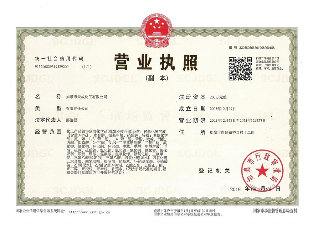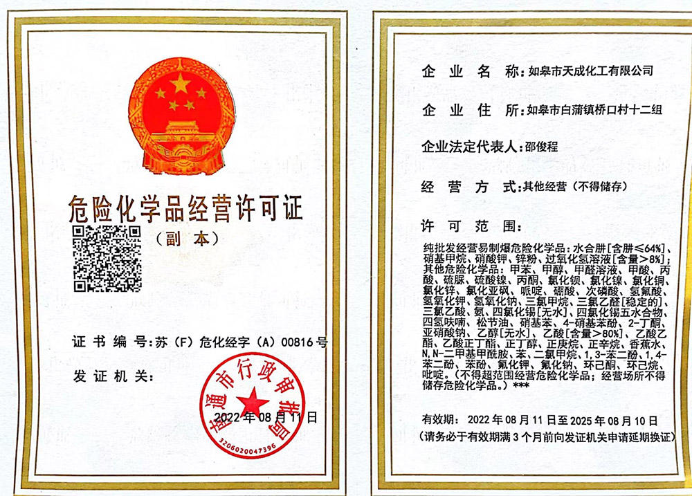 ?      如皋市天成化工有限公司創(chuàng)建于1996年。公司地處于美麗富饒的長(zhǎng)江三角洲,座落在古鎮(zhèn)林梓,通揚(yáng)運(yùn)河河畔。南瀕長(zhǎng)江、西臨204國(guó)道,距南通港、飛機(jī)場(chǎng)30公里,立體交通發(fā)達(dá)。公司經(jīng)營(yíng)管理規(guī)范,技術(shù)力量雄厚,擁有一批高、中級(jí)專業(yè)技術(shù)人才。   公司主要產(chǎn)品為:無(wú)水四氯化錫、結(jié)晶四氯化錫、氯化亞錫、三氯乙酸、甲酸銨、苯甲酸銨、對(duì)硝基苯酚、對(duì)硝基苯甲酸、苯乙醛、癸醛、防腐劑等。產(chǎn)品品質(zhì)優(yōu)異、價(jià)格合理,主要銷往北京、上海、廣州、福州、安徽、江西等省市,并出口歐美、東南亞等國(guó)家和地區(qū),一直深受廣大新、老用戶的好評(píng)。   公司連年被評(píng)為“重合同守信用企...[更多內(nèi)容]